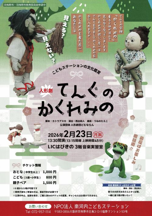 2月23日(月・祝)、大阪府羽曳野市の「LICはびきの」にて、南河内こどもステーションさん主催の文化鑑賞が開催されます。