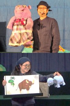 代表者3人ぐらいに舞台に出てきてもらい、劇に出てきた人形を動かすのに挑戦していただきます。